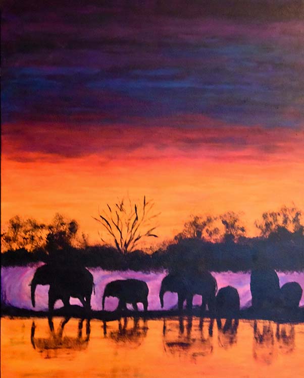Because all of my paintings are reinterpretations of my photographic images, each rep-resents a special memory. Sunset at the Watering Hole is based on a striking scene on my second night in Zimbabwe, in southern Africa. Our guide brought us to an area where we could observe a watering hole. Just as the sun was setting and the sky was being painted with a palette that ranged from vibrant yellows and oranges to a deep vio-let, a herd of elephants magically appeared, barely visible, but silhouetted against the painted background. Truthfully, no painting or photograph could capture the entire vista from that beautiful evening; nor could it recreate the sensation of the cool breeze or the sounds of the jungle. It was that memorable night that inspired this colorful painting.
