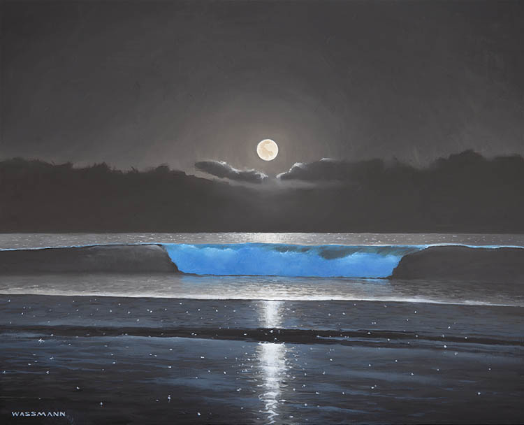 At the same time people were being encouraged to light blue lights as a show of support for health care workers the ocean up and down the SoCal coast was hit with a red tide that made the waves glow blue for over 3 weeks including during a Supermoon. Difficult to photograph, I decided to do a rendition in oil paint of what I experienced that night at 4am.